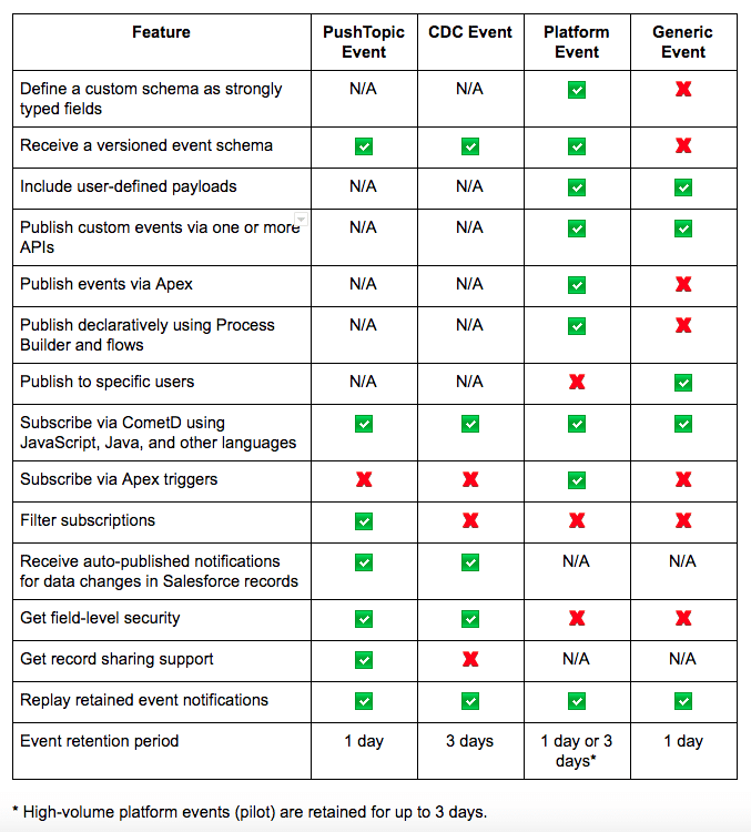 PushTopic eventsGeneric eventsPlatform eventsChange Data Capture events. Streaming Event features comparison.