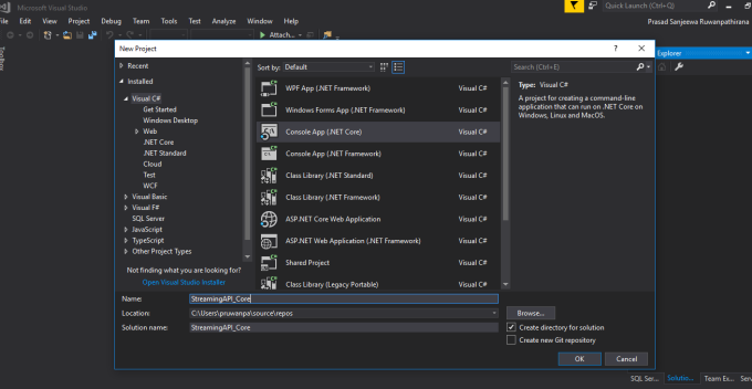Here I'm creating a .net core console application in order to keep it simple. And also I'm using visual studio community 2017 as the IDE in windows. You can use visual studio code if you are going to coding in Linux, Mac or Windows. I'm using Visual studio Community 2017 because I'm fan of it and it's integrated with the Nuget package manager. If you are using visual studio code use need to install Nuget CLI or Nuget extension for visual studio code in order to install packages from Nuget.