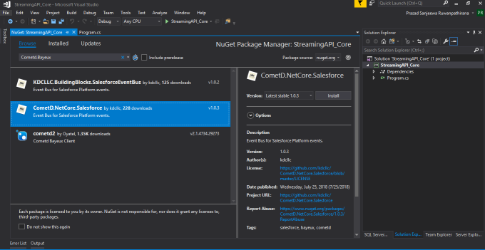 Now you need to install cometd event and message routing bus in order to subscribe to push topic notifications. Just right click on the project and click on "Manage Nuget Packages". Then you need to browse "Cometd.Bayeux" in the panel and install the package.