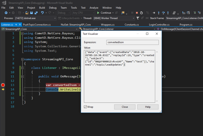 Now all the needed code is implemented in the console app in order to grab the response from the salesforce via streaming api. You can test the events by creating / updating or deleting the lead objects.
