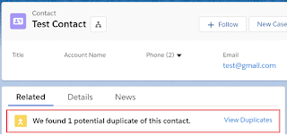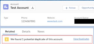 When you are viewing a specific record, if Salesforce detects a duplicate record, the duplicate component will display as seen below: