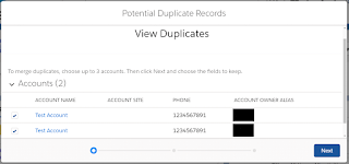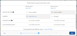The next screen allows the user to make a few different choices about how to combine the information from the two records. The last step is to select one account record as the master record and choose the desired field values that the user wishes to keep using the radio button. Click on Next option.