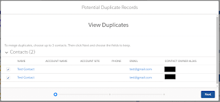 Merging Duplicate Contacts in Salesforce Lightning: Here are the steps that a user needs to follow if merging contacts in Salesforce Lightning: When the user is viewing a specific record, if Salesforce detects any duplicate records, the duplicate component will display as seen below: