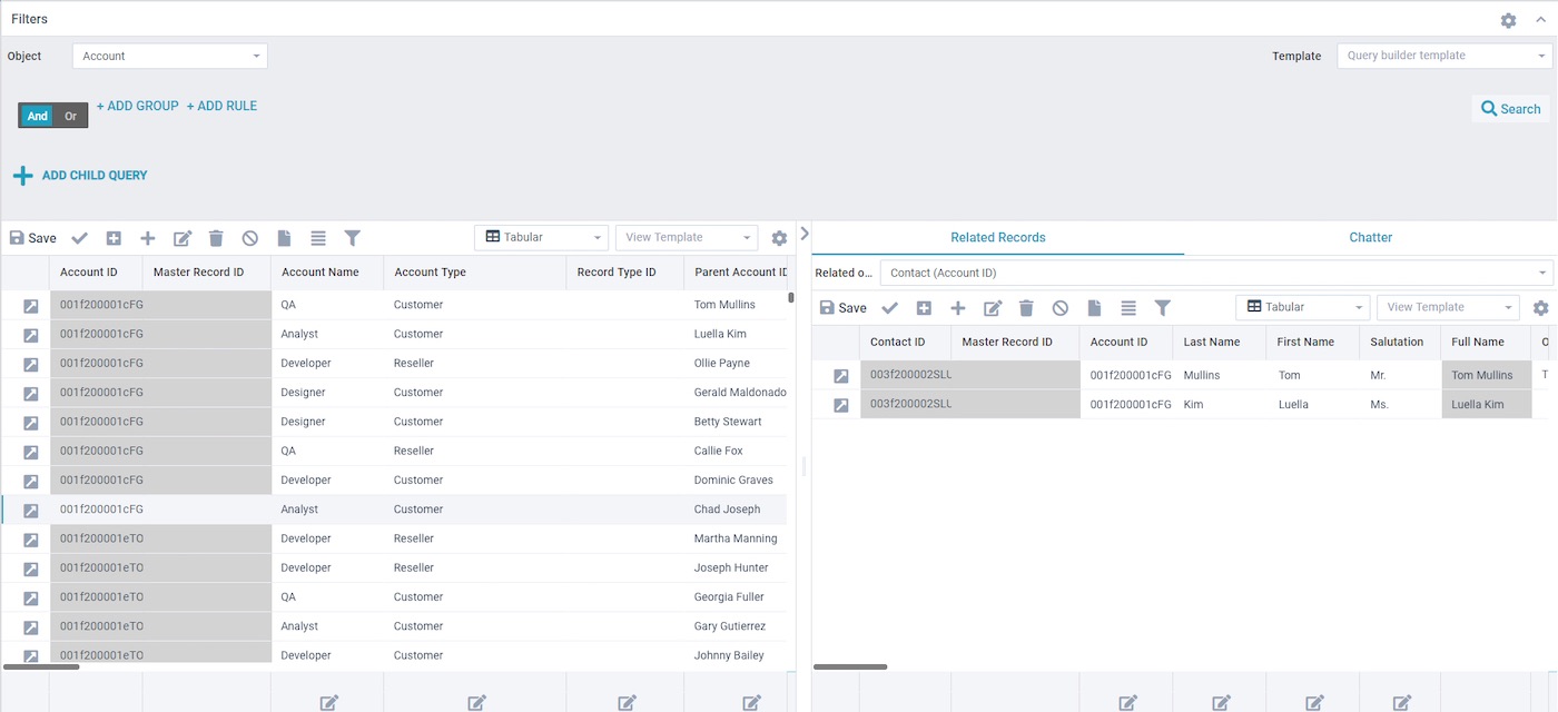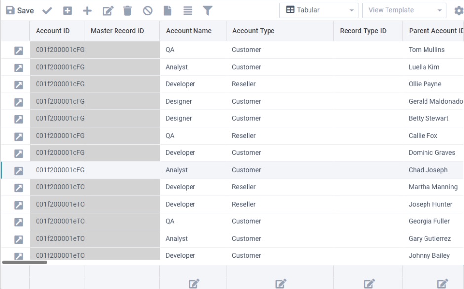Tabular view enables effortlessly viewing, grouping, and mass-updating data. This view provides a user with a data table where columns are fields of the selected object, and rows are records of this object.