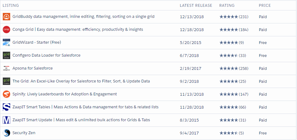 On the screenshot below, there are some examples of the highest rated grid components created by different developers for Salesforce: