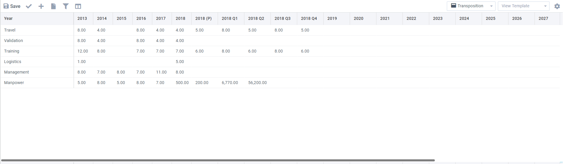This view helps to reduce the effort for creating and editing new records. Users can create multiple new records with a single transaction rather than adding them one-by-one. The transposition view can be used to create complex revenue forecasting and product management applications that work with a lot of related records.