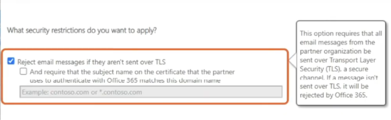 - click next and check the check box reject email messages if there aren't over TLS