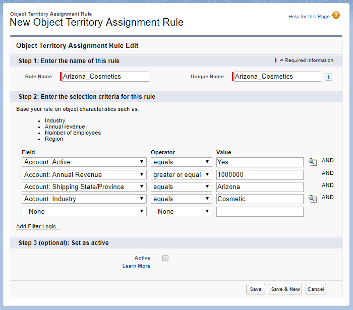 Define assignment rules. Once you’ve prepared a territory chart, you can create territory Assignment Rules based on defined characteristics. For example, accounts with X state, Y revenue, and Z industry belong to Territory A. This gives all users of the Territory immediate access to corresponding accounts.