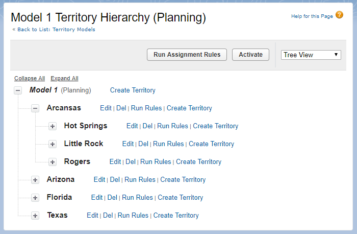 Create a territory hierarchy. For example, you can create a master territory “North America” and break it into smaller territories, say, “United States“, “Canada”, and “Mexico.” Then, you can add more child territories, such as “Western,” “Central,” “Southern,” and “Eastern” regions and expand each of them with more detailed territories.