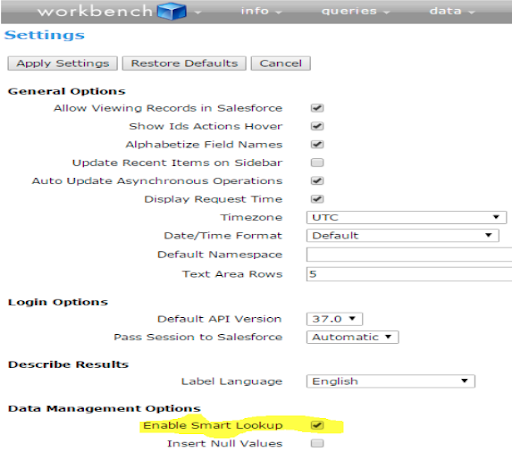 Data Management one amongst Workbench’s best utility is termed smart operation, which helps you in replacement the VLOOKUP alternative in standout. A smart operation is utilized simply just in case Insert, Update, Upsert or Delete operate and it's not obligatory, it'll assist you to supply normal id operation field price with Salesforce Ids mechanically. to Illustrate, if you have got got a CSV file for Case object to update existing records with entirely totally different Case house owners, as regular observe we'd extract the present Case records including as we have a tendency toll as together with the Case Owner field then we update the Case Owner field with new Users as per demand. but on the exploitation bench, we are able to update Case house owners info directly once API will do it by trying up the Case Owner ID by using good lookup operate. To urge these advantages, 1st we've modified good operation features in settings.
