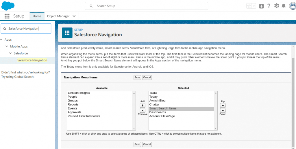 - Go to under Setup and Search “Salesforce Navigation”. After that move, the required items from Available to Selected and also placed the “Smart Search Items” in the selected section.