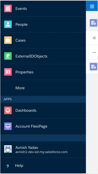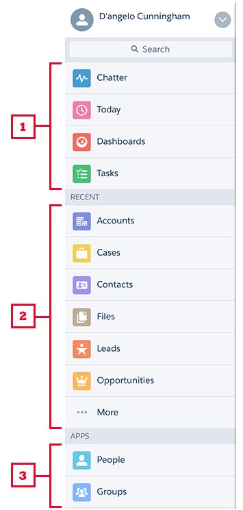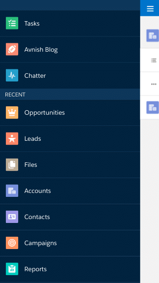 Navigation Menu of Salesforce1- It is navigation bar by we can access different standard objects or custom objects, visualforce page, Lightning component, and Lightning Page.