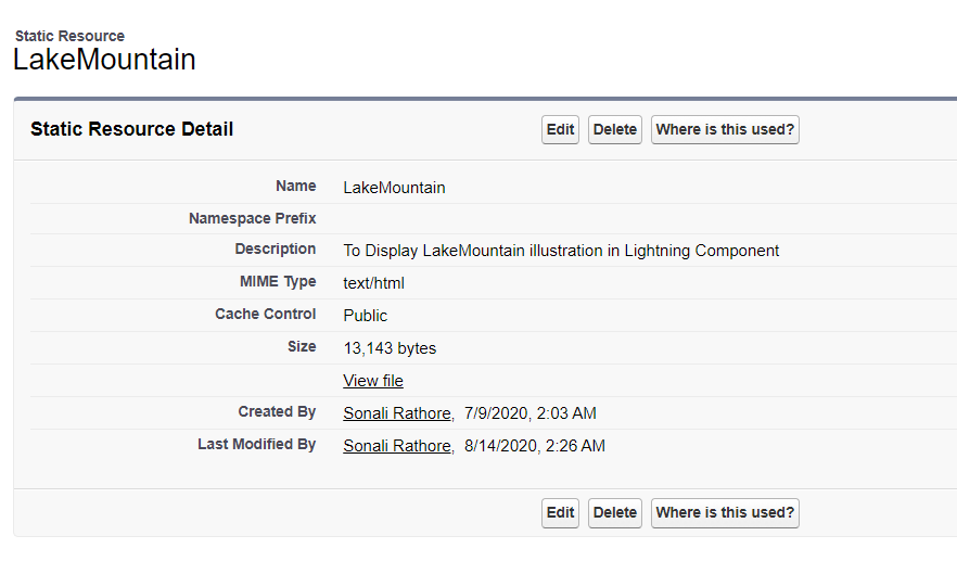 - Create a new public static resource named “LakeMountain” and upload the above “LakeMoutain.html” file and Save it.