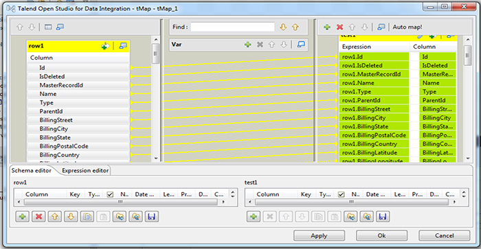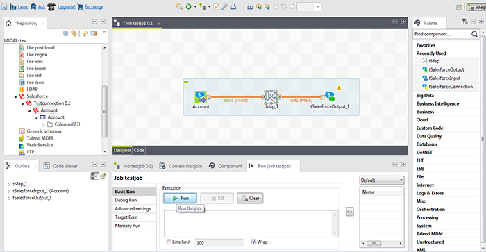 Connecting using this process will only be purposeful when you don’t have to map the data for transfer. But when you opt for a little complicated transfer like transferring data of a custom module from one Salesforce org to another you have to reach out for options like tMap connect available in the Process menu. Drag and drop the component and connect the input element to the tMap and the tMap to the output element.