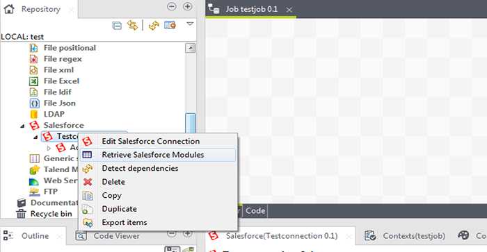 Talend has inbuilt metadata connector for Salesforce. Locate the metadata section in the repository panel and then find Salesforce in the expanded section then right click and select Create Salesforce Connection.
