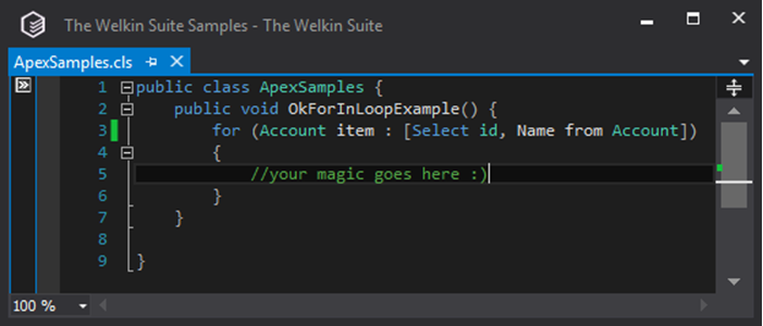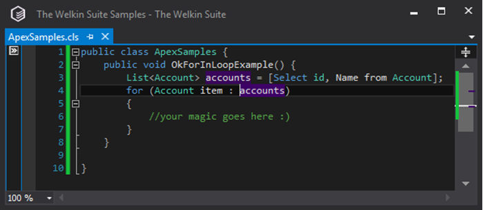 There are no crazy incorrect things like querying data from the database inside for the loop (if we don't talk about the query itself), but anyway it's not exactly good. In cases where there are more than 200 records in satisfying your query, it would be a waste of a heap to load all of them at once (and this is exactly what would be done in the case above). However, a very small change, which is illustrated below, (you can see the change highlighted in line #3) would force Salesforce to load into the heap small batches of 200 records at a time, which can prevent you from getting runtime exceptions on organizations that have a lot of data.