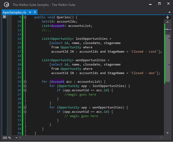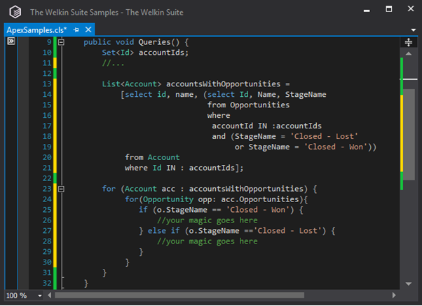 Here we use a single query, to select the accounts with the related opportunities, and then we would have only one loop inside another one. This makes the query a bit more complex, and yet it is really beneficial related to two different Governor Limits.