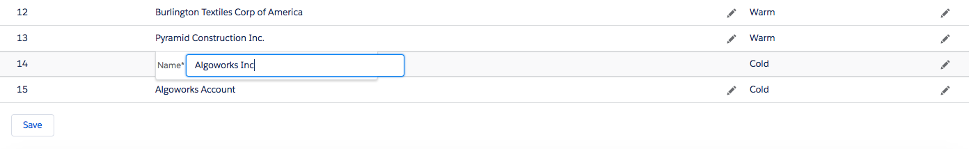 The idea behind the inline edit is that I am rendering two fields for each field one in output format and another in input format but only one visible at a time. When the component is loaded records will be shown in the output format. When the user clicks on the pencil icon the input format component is shown, at the same time Save button is activated. The user can change field value and save the record.