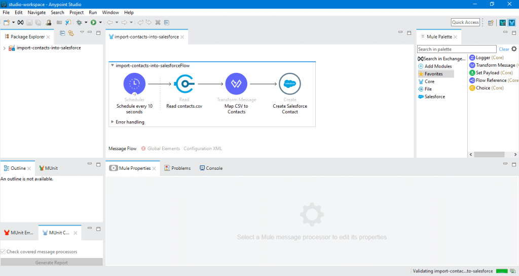 In the Package Explorer, click the src/main/resources folder to expand it, then find the contacts.csv file inside this folder. Double-click the File config tab in the Global Elements tab and set the Working Directory field to point to the src/main/resources folder. In the Package Explorer, right-click the import-contacts-into-salesforce project, then select Run As > Mule Application.