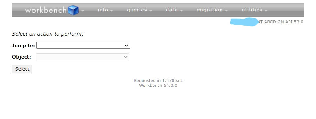 3. After successful login to the Salesforce Workbench, you will get the Jump to option in which you can choose between the following options to perform a required task: