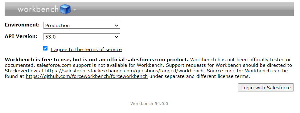 1. Select the environment (Production or sandbox) and API version of your choice and click on the checkbox “I agree to the terms of service”.