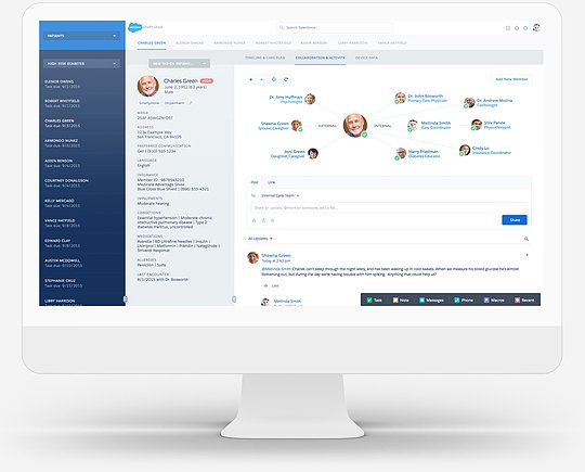 Salesforce Health Cloud is a health IT CRM framework that includes resources for managing doctor-patient relationships and records. Patients may use Private Communities to view treatment plans, chat with health providers, find answers to popular questions, and fill out forms ahead of time to save time at appointments.