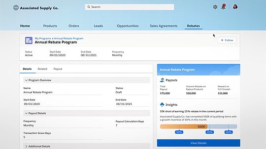 Typically, sales teams do not have insight into the refund qualification status of customers. The sales team can have a comprehensive view of a channel partner's participation in the program, including real-time insights. With rebate management capabilities, sales officers can look up channel partners to gain visibility into recent transactions and what it would take for customers to secure larger payouts.