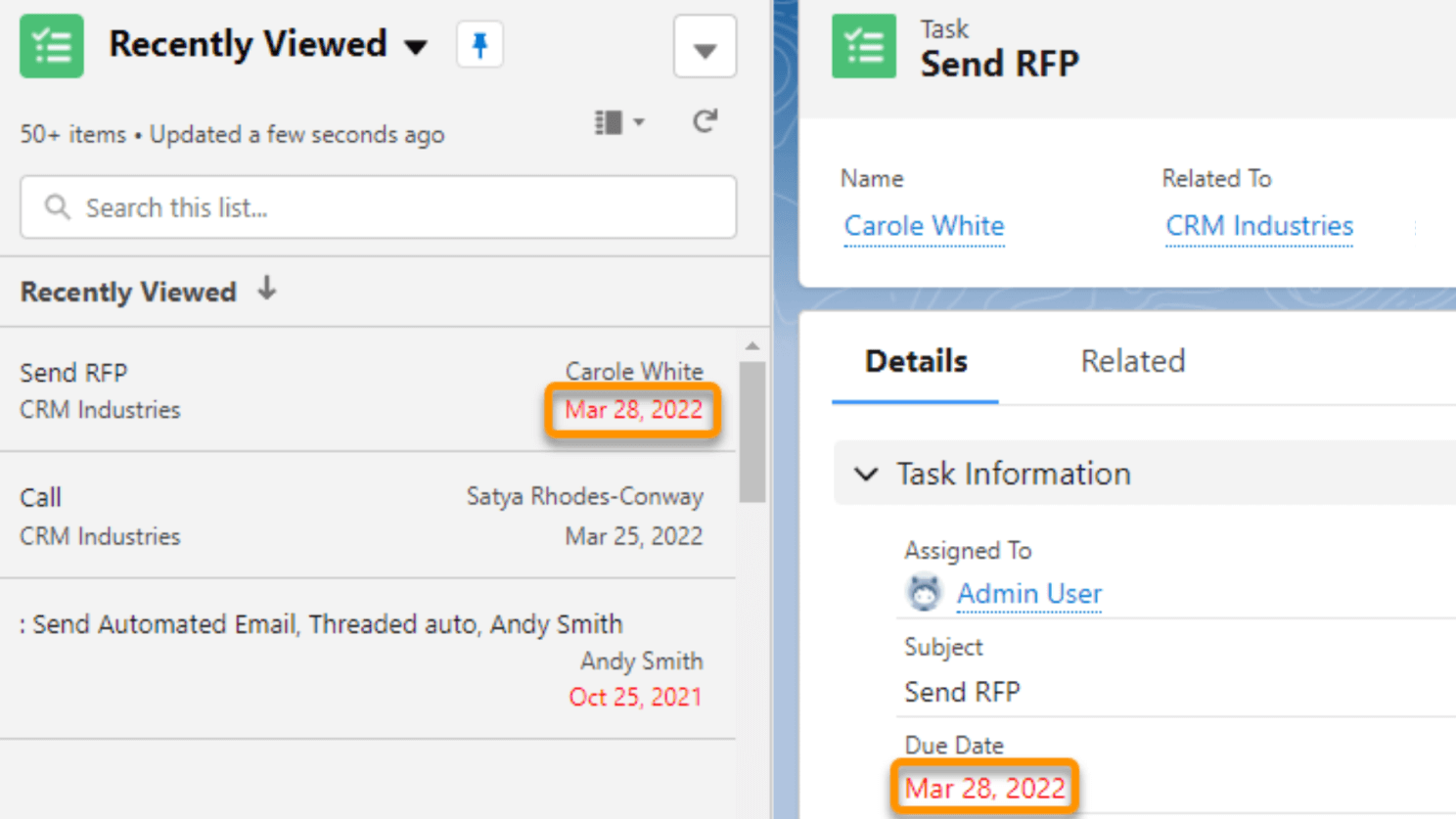 Now overdue tasks are highlighted in red to catch your eye. The date appears in red in the activity timeline, the task list view, the task detail view, the task Kanban view, and the task split view. So it's obvious on which task you should work first.