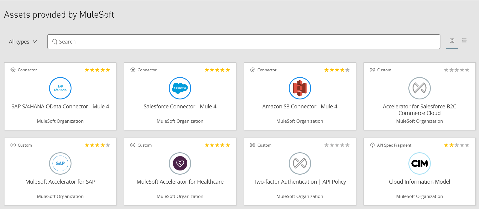 - Anypoint Exchange: The prebuilt asset marketplace of the MuleSoft ecosystem. In it you can find a great variety of connectors, templates, examples, and APIs that you can incorporate into your applications. If you want to save time, this is the first place you should turn to to find what you need. Anypoint Exchange allows you to save, share, and reuse development using best practices. You can also view, test APIs and simulate data for APIs with Mocking Service.