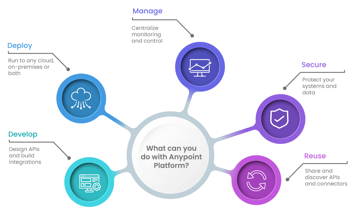 The platform was created so that IT teams can design, develop and reuse APIs, as well as monitor and manage APIs and integrations in a centralized web. AnyPoint Platform has an integration platform as a service (iPaaS) approach and is powered by the Mule runtime engine (a unique universal engine for connecting applications, data, and devices) which is a lightweight enterprise service bus (ESB) based on Java. Furthermore, it includes the following components: