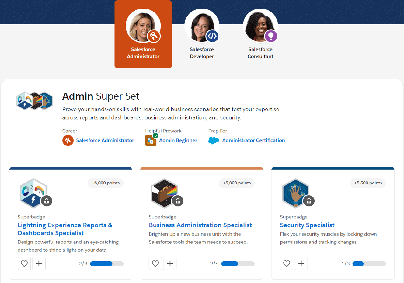 Superbadges are domain-based credentials that allow you to apply your Salesforce skills in a specific area (think: process automation or app customization) to hands-on, real-world business problems. There is no better way to advance your career and demonstrate your hands-on capabilities with Salesforce products.