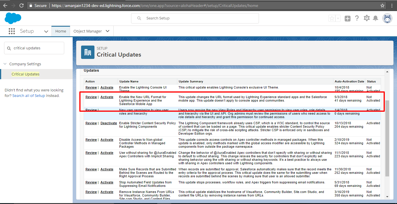 This post taks about the upcoming new URL format for Salesforce Lightning experience ans Salesforce mobile. The new URL format will be available to users in salesforce summer ‘18 release. The new URL format can be test by activating the critical update for new URL format from Critical Update Console (CRUC) setting. Once the new format has enabled in your salesforce org,you can only revert back to the original URL format by logging a case with the salesforce support for disabling it from your Org.