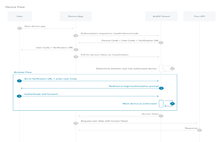 - After the user successfully completes the browser flow path, the Auth0 authorization server responds with an access token (and optionally a refresh token). The device app should forget the device passcode when it expires.