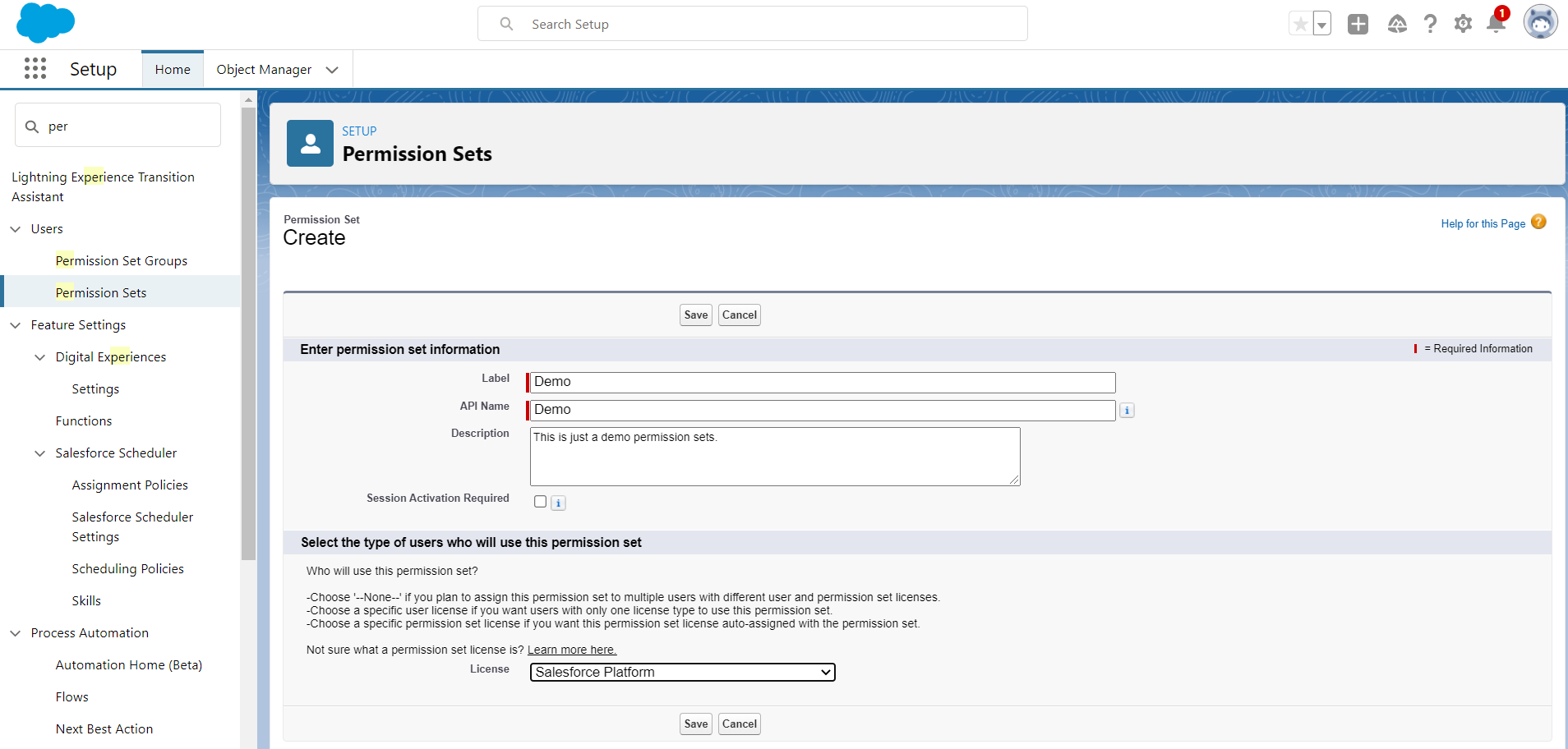 This means here I choose the "Salesforce Platform" License so I can assign this permission set to only those users who have the “Salesforce Platform” License.