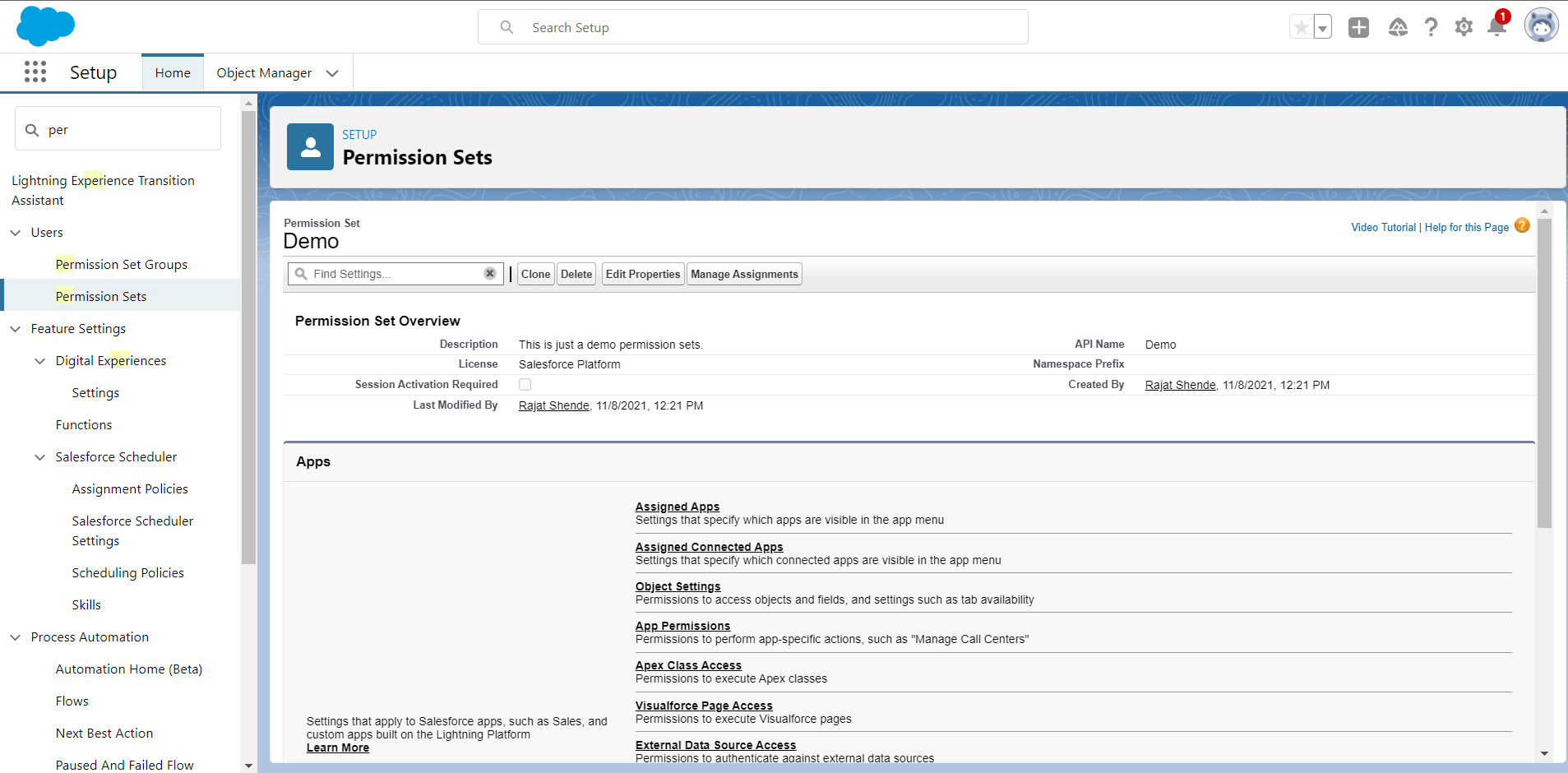 Step 4: Click on the ‘Save’ Button. Hence your permission set is created and you can manage permissions on this permission set and will assign this permission set to the user.