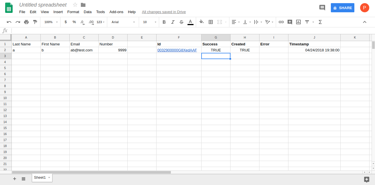 - You can see in your Google sheet that "ID", "Success", "Created", "Error" and "Timestamp" columns are added with some info regarding your DML operation through Google Sheet to Salesforce org as shown in below image