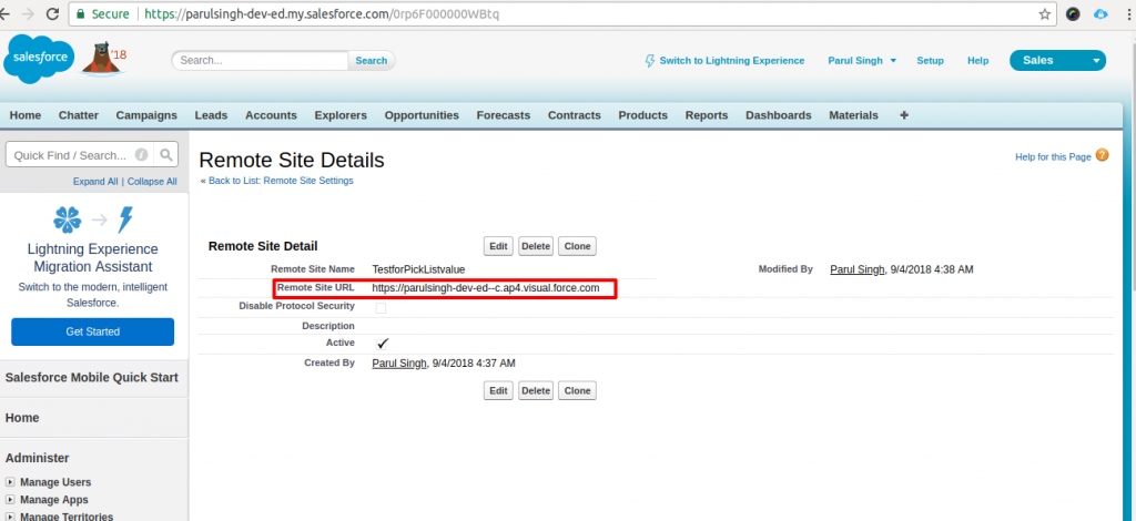 Now Enter details of the Remote site setting, in which Remote Site URL is your instance from the URL.
