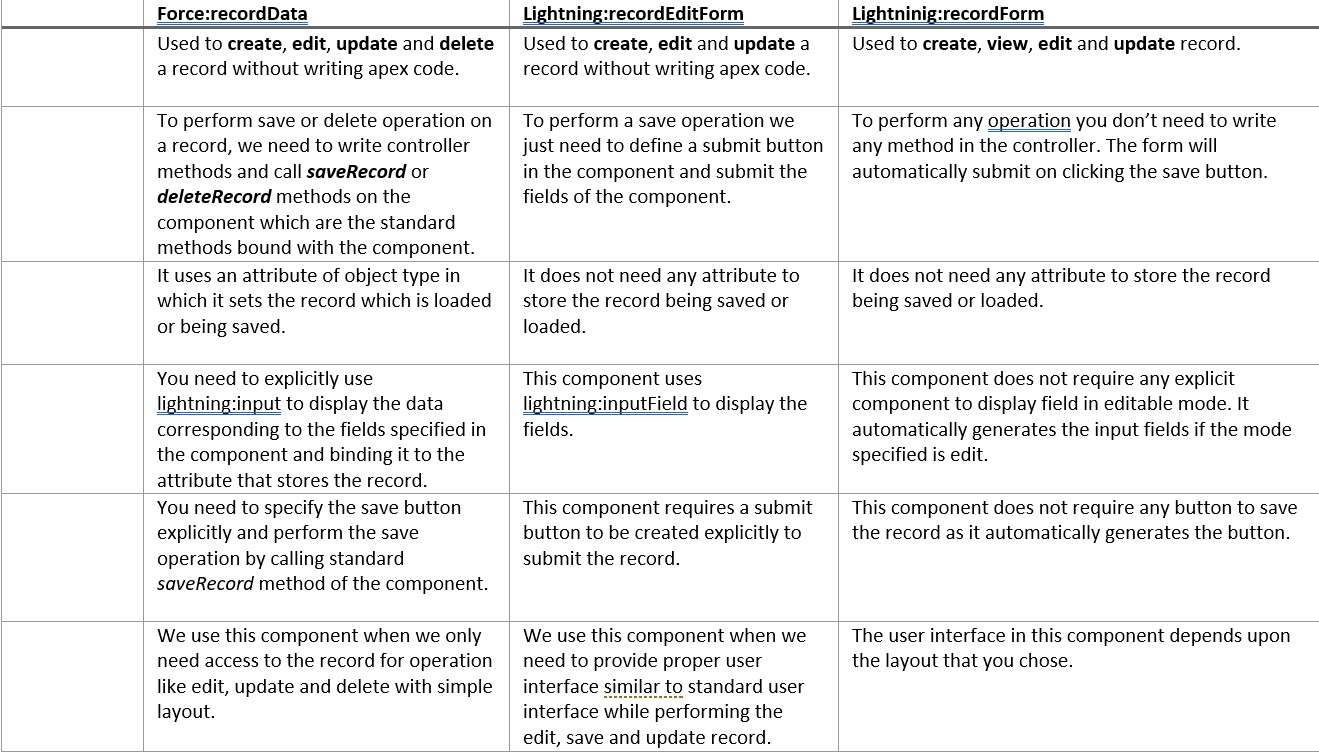 MemberSeptember 25, 2019 at 7:04 AM in reply to: What is the difference between lightning:recordForm and force:recordData in lightning component ? -