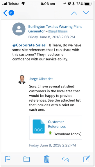 Gone are the days of “I’ll get back to you tomorrow with an answer”, they want quick decisive answers and they want them now. The Salesforce App on your cell phone can rescue you from this situation – post a quick message to your technical support team and before the meeting is over you have the answer. The response is permanently recorded on the opportunity or account record so you can incorporate it into any formal response you later provide to the customer.