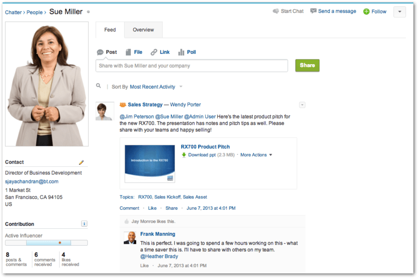 Sales Staff Departure One of your sales team leaves the company gets promoted or moved to another sales territory. Often this person has a great deal of knowledge about their customers that may not have been reflected in Salesforce. Maybe it’s just a subtle way in which they operate, who they are influenced by, or their favorite sports team. A quick shout out to the rest of the team can capture that key piece of information that you need to progress a deal. Having this information stored in Chatter on the contact record for this customer means it is always available in the future and can be a quick reminder for sales staff.