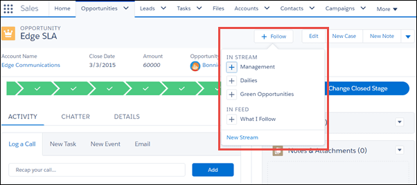 Follow What’s Important Want to keep an eye on all activities about a specific customer or opportunity? Following the account or opportunity record will keep you in touch with everything happening. Get instant notification when the deal reaches a critical stage or be notified when changes occur at the company, all without having to do any more than clicking the follow button.