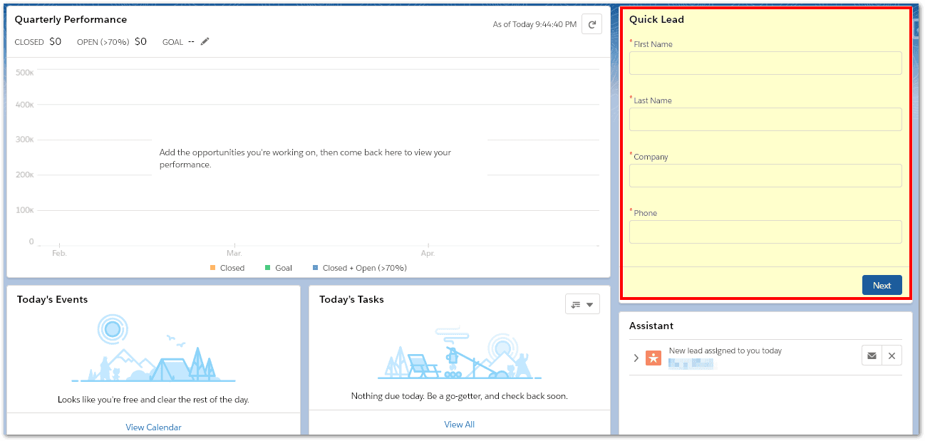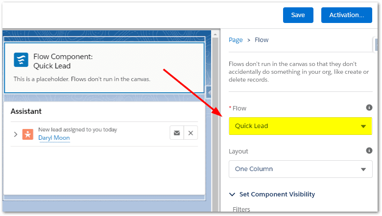Return to your App (eg Sales) and refresh the page (Shift + F5). Your new home page with the Quick Lead Flow component will be displayed.