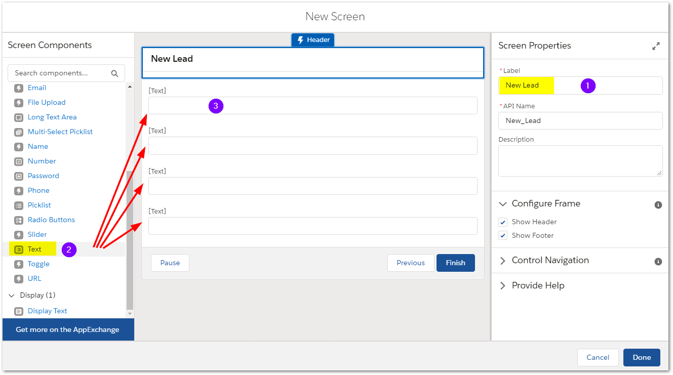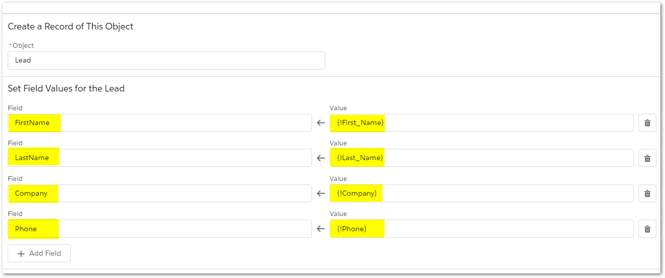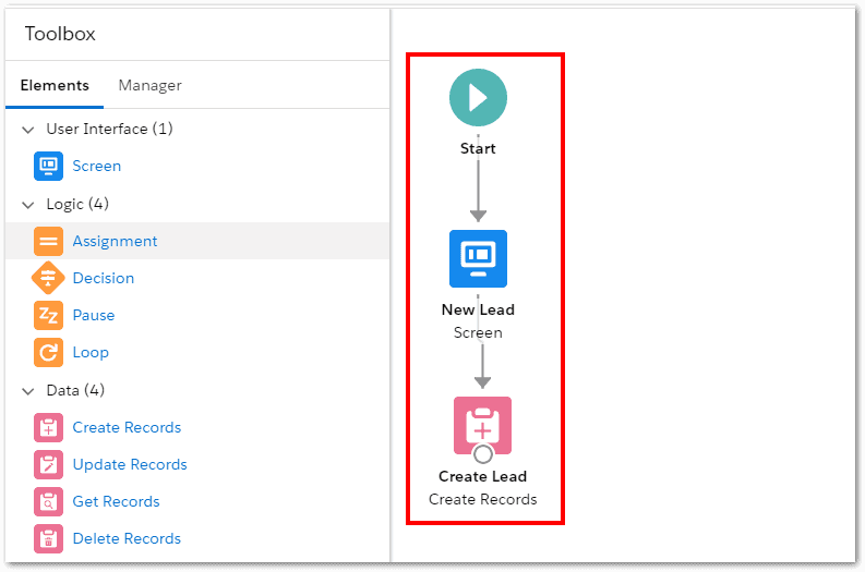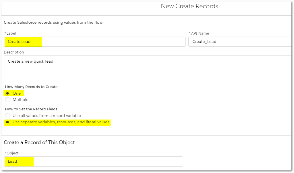 We will use the values collected from that Screen element to create the new lead record.