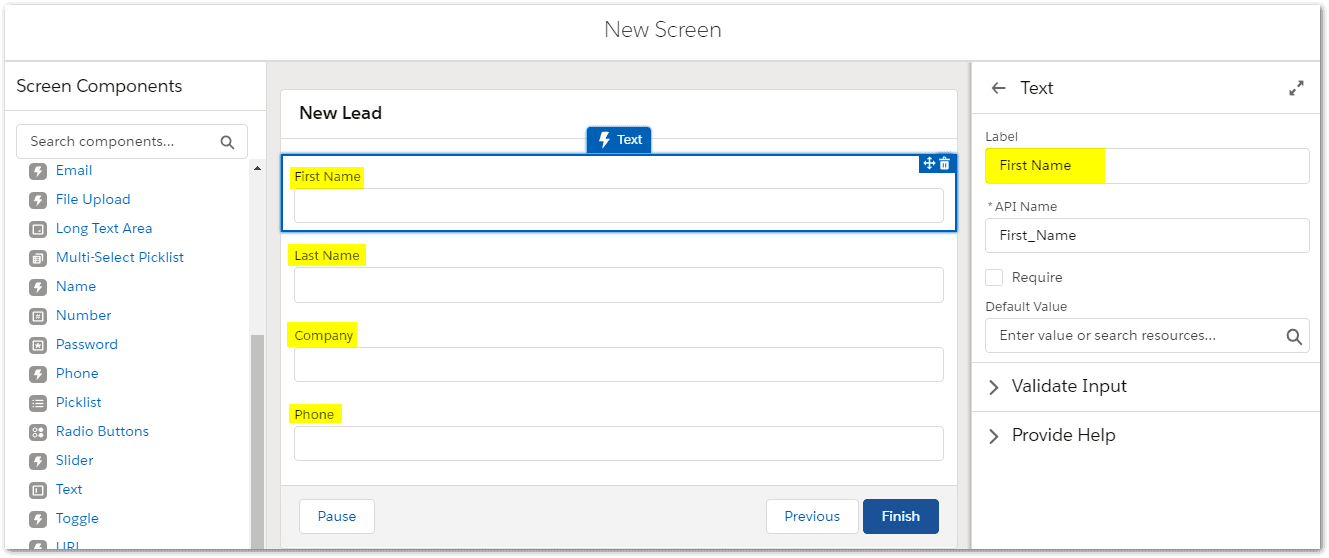 We will now create fields for First Name, Last Name, Company, and Phone.