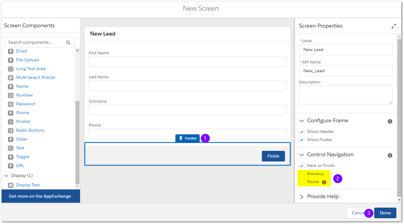 Click in the footer area of the form (1) and untick the Previous and Pause buttons (2) then click Done(3).