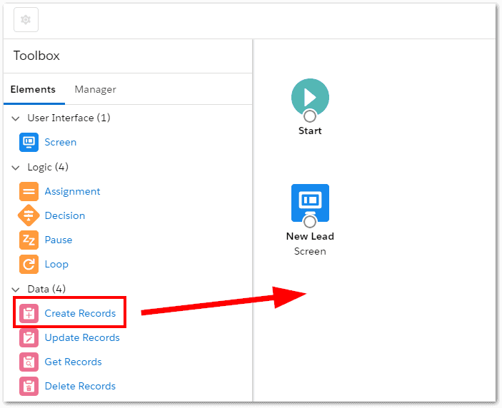 Next, drag the Create Records element to the canvas.