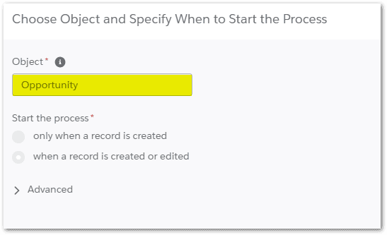 Select Opportunity as the object and Start the process: When a record is created or edited.