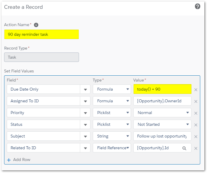 When an Opportunity meets all three criteria, we want to create a new Task for the Opportunity Owner and complete all the required task fields. The value of the due date will be today’s date plus 30 days (as highlighted in the formula below).