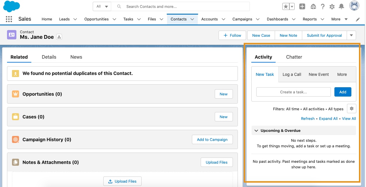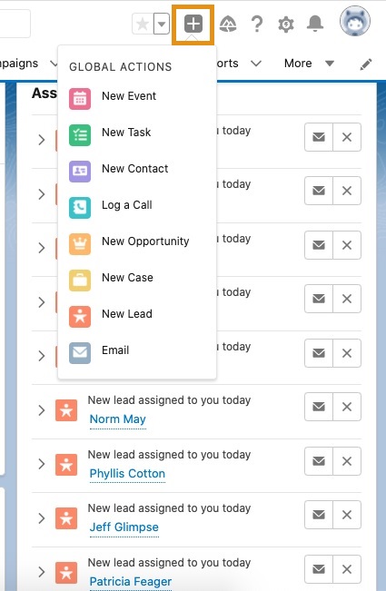 This feature allows users to log call details, create or update records, or send emails, all without leaving the page they’re on. Global Actions serve as a significant time-saver for your team and come in handy when trying to increase productivity. For more information on Global Actions setup, click here.