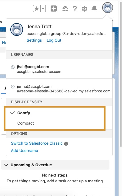 Did you know that you can control the density of your display? Salesforce makes it easy for users to control their screen layout. Two options, “Comfortable” and “Compact” will change the amount of information shown on the screen at once, which is great for those wanting to maximize the amount of datap that’s visible. For more information on controlling display density, click here.